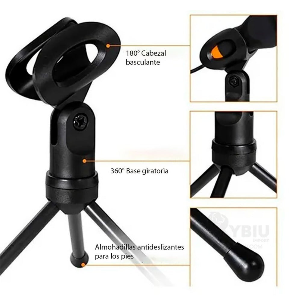 Base tipo trípode incluida: Viene con un soporte de trípode que te permite colocar el micrófono en tu escritorio de forma estable y ajustable, liberando tus manos.
