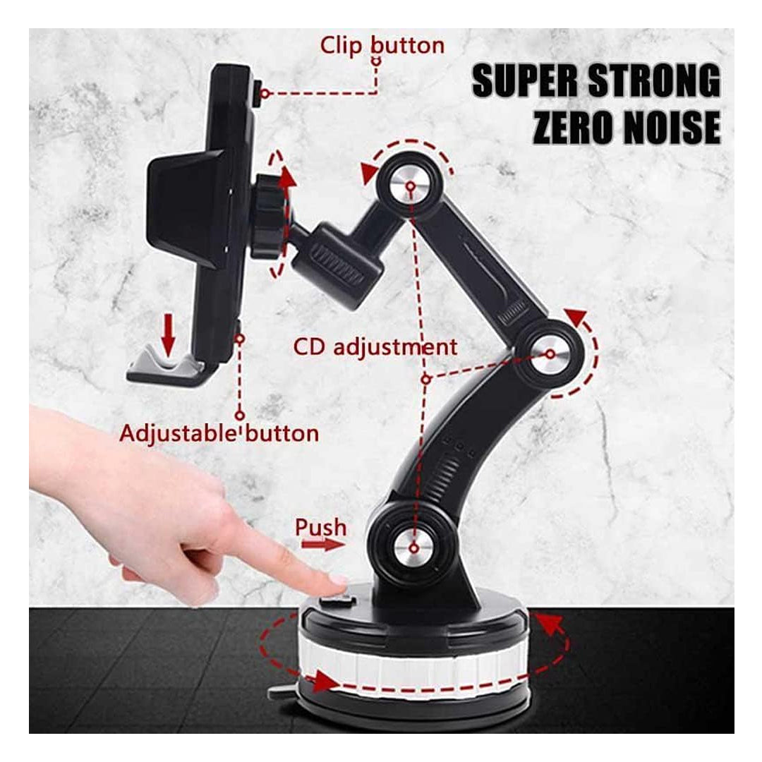 Funcionalidad: Soporte de celular para automóvil con brazo articulado y base de ventosa.